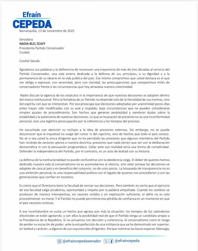Aquí la carta completa del senador Efraín Cepeda a la presidenta del partido Conservador, Nadia Blel:
