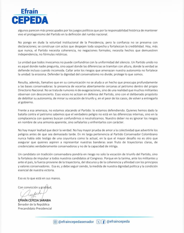 Cepeda también hace referencia a un asunto que, según él, inquieta a las bases: “Resulta, además, llamativo que en su comunicación no se aluda a un hecho que preocupa profundamente a las bases conservadoras: la presencia de vocerías abiertamente cercanas al petrismo dentro del propio Directorio Nacional”.