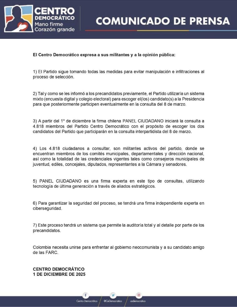 Según la colectividad, el Centro Democrático implementará un mecanismo mixto que combina encuesta digital con un colegio electoral. Esta metodología ya había sido comunicada a los precandidatos y busca, según el comunicado, evitar “manipulación e infiltraciones” en la selección.