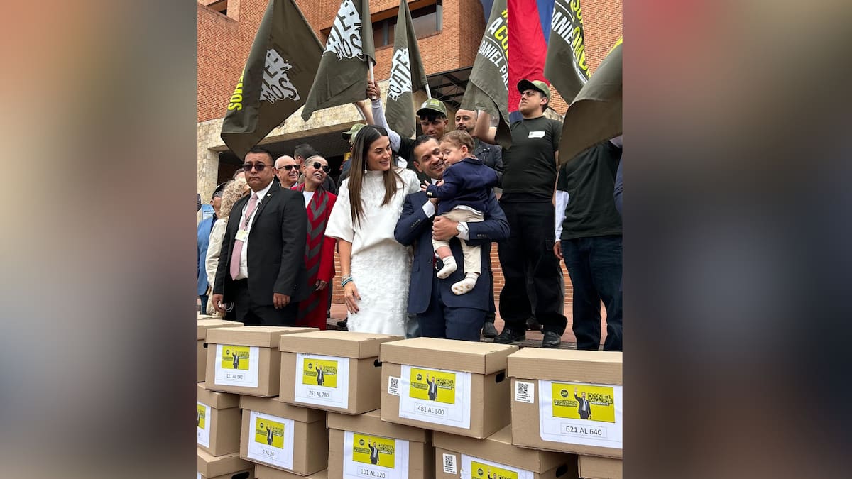 Daniel Palacios llegó este miércoles, con su esposa y su hijo, a la Registraduría Nacional, alrededor de las 9:05 a. m., con el objetivo de radicar cerca de 1.200.000 firmas, con las que busca avalar su candidatura a la Presidencia de la República, de cara a las elecciones de 2026.