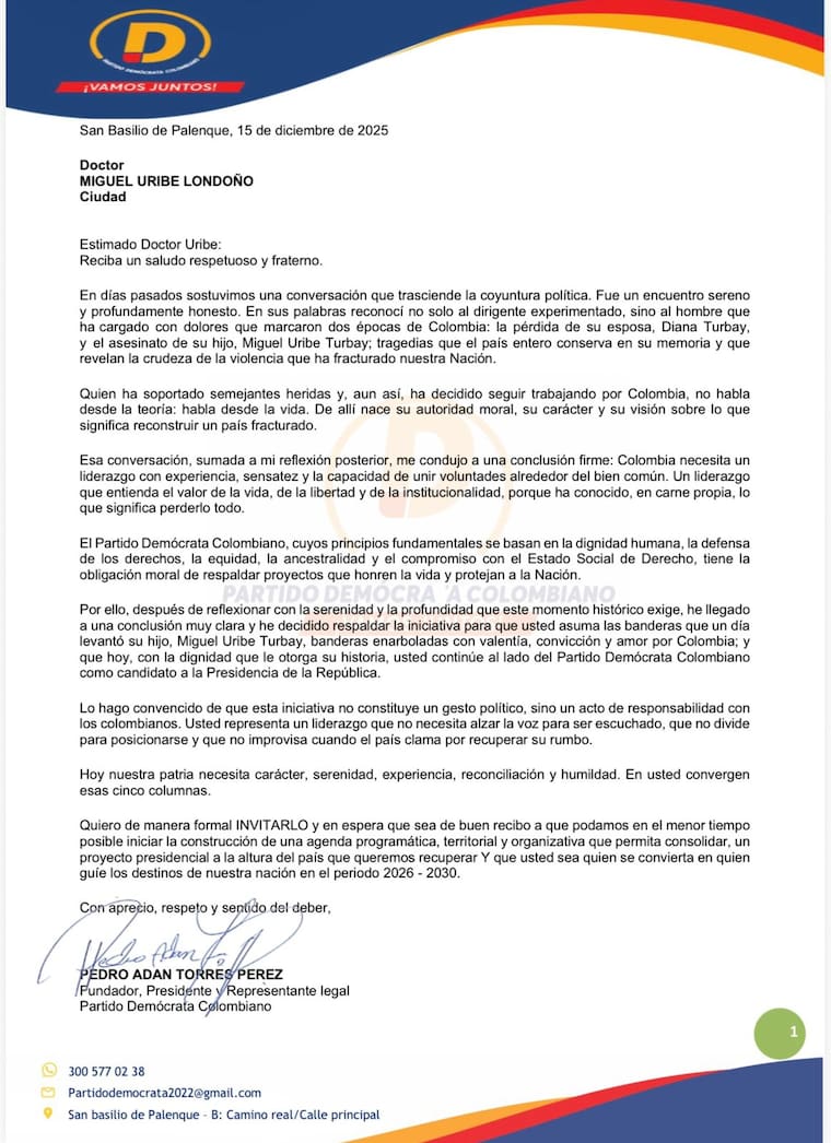 El Partido Demócrata Colombiano anunció este lunes su respaldo al candidato presidencial Miguel Uribe Londoño, padre del inmolado Miguel Uribe Turbay.