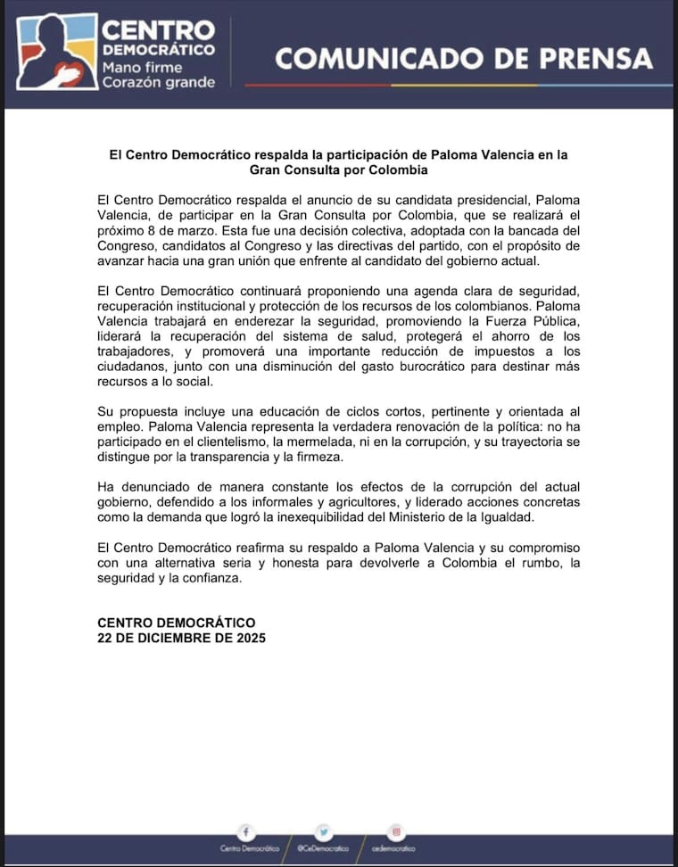 Finalmente, el Centro Democrático reafirmó su apoyo a Paloma Valencia y aseguró que continuará impulsando una alternativa política que, a su juicio, permita recuperar el rumbo del país, fortalecer la seguridad y restablecer la confianza institucional.