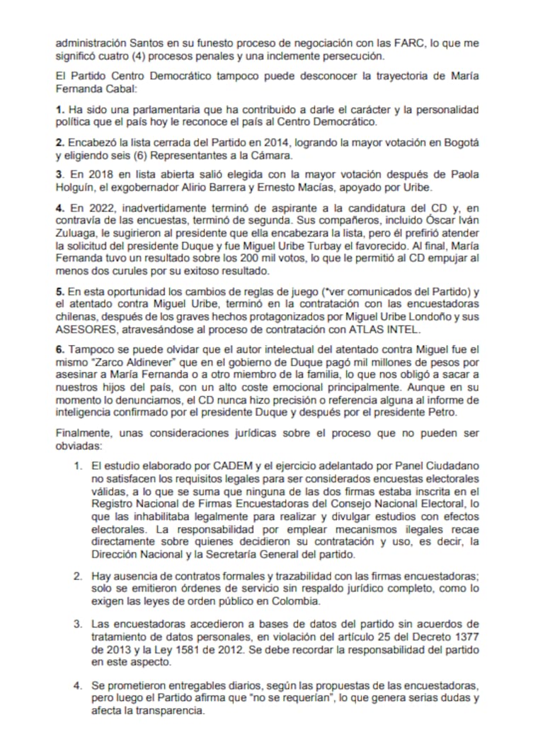 “No puedo dejar de advertir que, en el “vaya y venga” de las decisiones, al ritmo de velados intereses entonces, hoy evidentes, no solo se vio afectada la imagen del partido ante sus bases y ante la opinión pública, sino que el acomodo de las fechas de resultados y anuncios redundó en la expulsión de facto de las precandidatas Paola Holguín y Maria Fernanda Cabal, que habrían podido seguir prestando, como hasta ahora, un gran servicio al partido y al país, servicio del que el partido mismo decidió prescindir", señala.