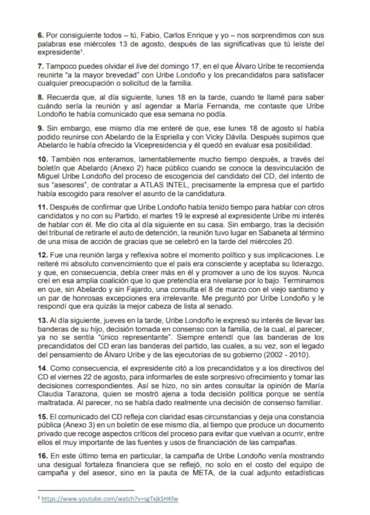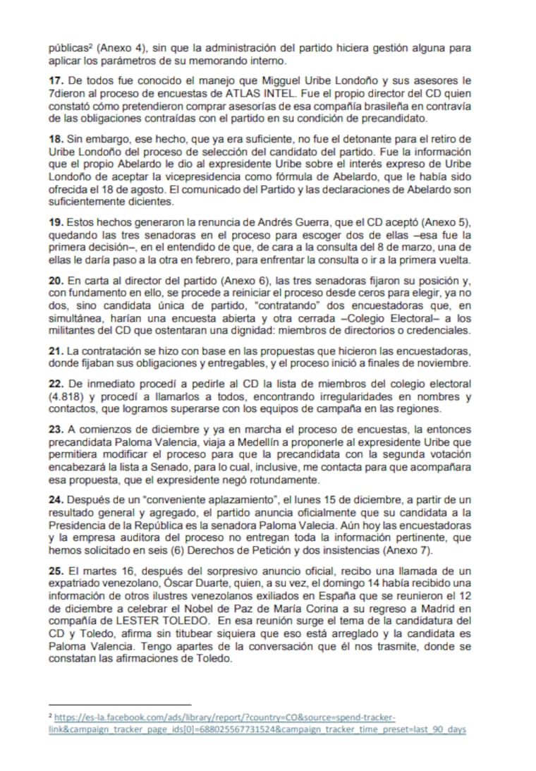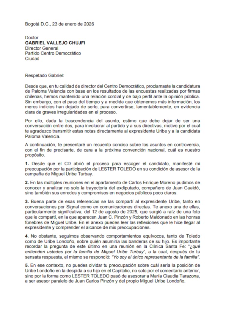 “El martes 16, después del sorpresivo anuncio oficial, recibo una llamada de un expatriado venezolano, Oscar Duarte, quien, a su vez, el domingo 14 había recibido una información de otros ilustres venezolanos exiliados en España que se reunieron el 12 de diciembre a celebrar el Nobel de Paz de María Corina a su regreso a Madrid en compañía de LESTER TOLEDO. En esa reunión surge el tema de la candidatura del CD y Toledo, y afirma sin titubear siquiera que eso está arreglado y la candidata es Paloma Valencia. Tengo apartes de la conversación que él nos transmite, donde se constatan las afirmaciones de Toledo”, afirma Lafaurie en la carta.