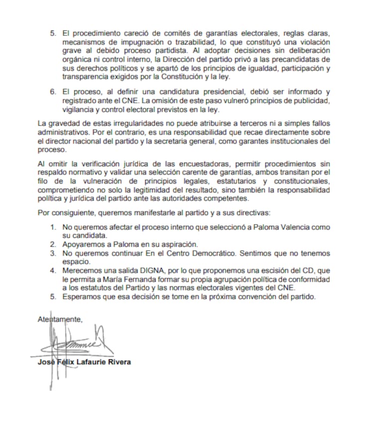 El dirigente ganadero José Félix Lafaurie anunció, mediante una extensa carta dirigida a la dirección nacional del Centro Democrático, que junto a su esposa, la senadora María Fernanda Cabal, decidió separarse del partido y promover una escisión, en medio de fuertes cuestionamientos al proceso interno mediante el cual Paloma Valencia fue seleccionada como candidata presidencial.