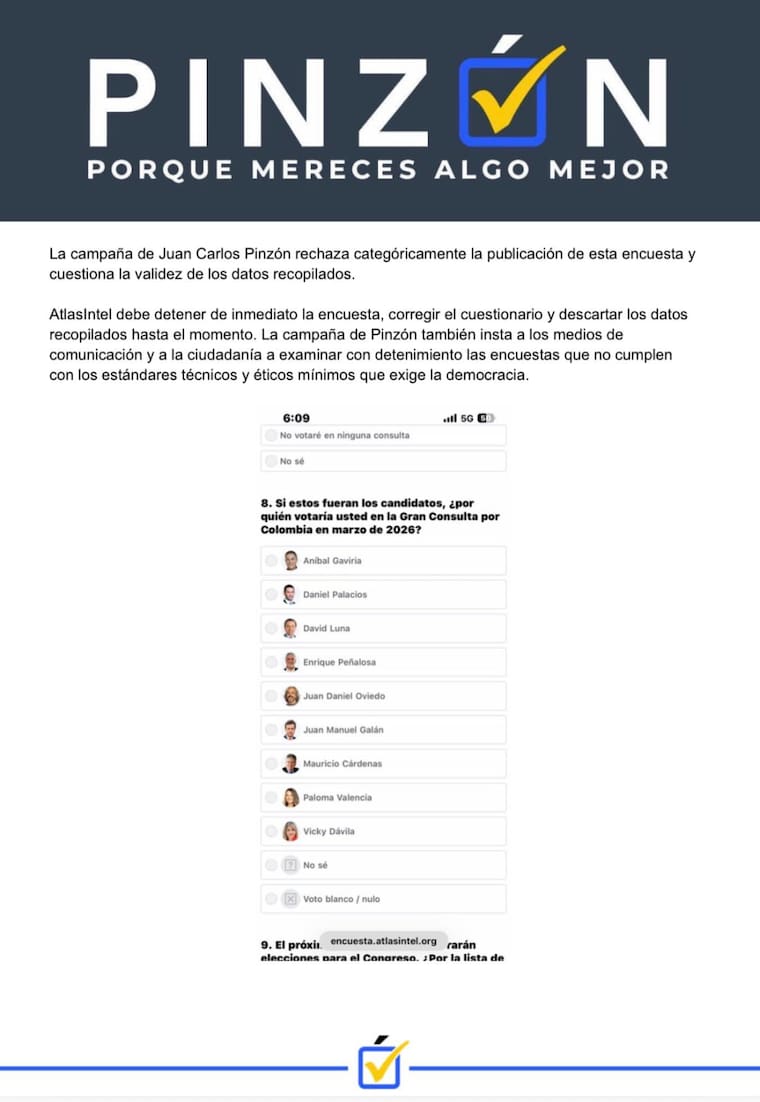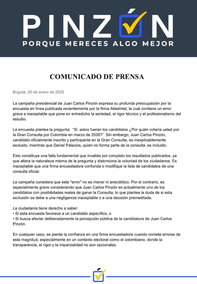 Según el pronunciamiento, la encuesta formuló la pregunta: “Si estos fueran los candidatos, ¿por quién votaría usted por la Gran Consulta por Colombia en marzo de 2026?”. No obstante, el nombre de Juan Carlos Pinzón no apareció entre las opciones, mientras que sí fue incluido Daniel Palacios, quien no hace parte de esa consulta.
