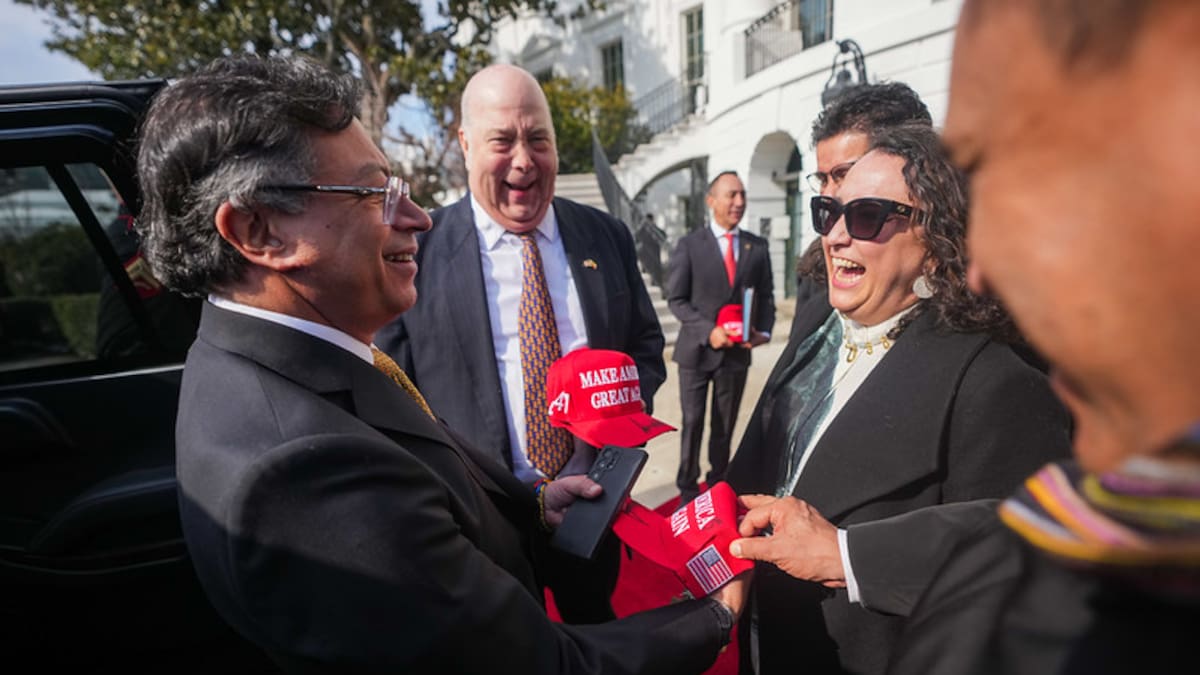 En las imágenes se ve al jefe de Estado colombiano sonriendo mientras recibía otras gorras con el mismo mensaje que se ha convertido en uno de los lemas que más ha impulsado Trump desde que volvió a la Casa Blanca en enero de 2025.
