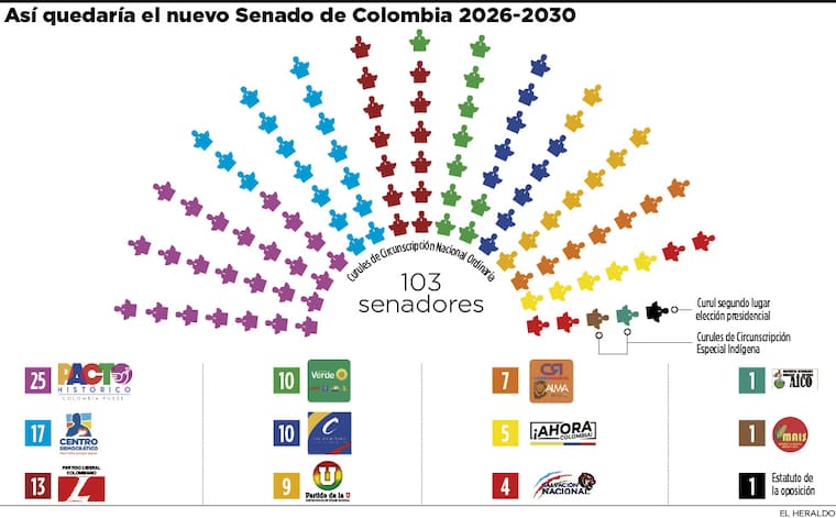 El Pacto Histórico, con 25 curules fijas, y el Centro Democrático, con al menos 17 asientos asegurados, se consolidaron como las dos fuerzas políticas con mayor presencia en el salón elíptico, seguidos de los partidos Liberal, Alianza Verde y el Conservador, que al interior de sus movimientos afrontan importantes divisiones al momento de seguir los lineamientos de los directorios nacionales.
