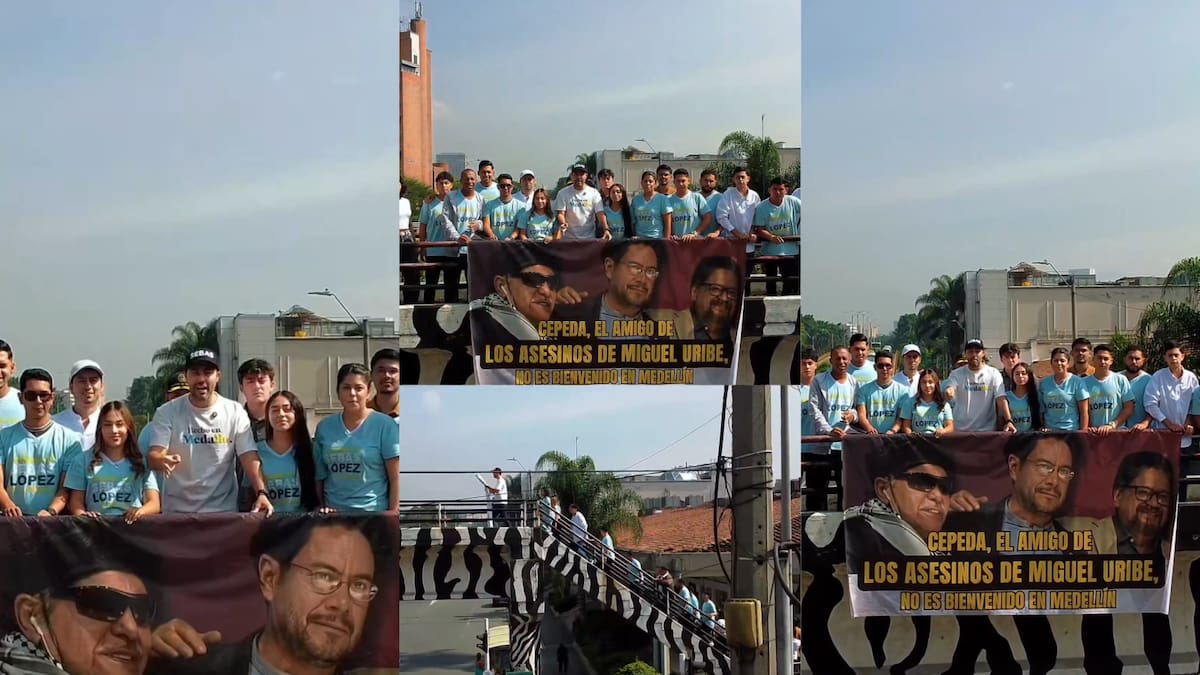 En medio de la visita del senador y candidato presidencial Iván Cepeda a Medellín este fin de semana, el concejal Sebastián López, vocero del Centro Democrático, protagonizó una manifestación junto a un grupo de jóvenes en uno de los puentes por donde transitó la caravana del dirigente político de izquierda.