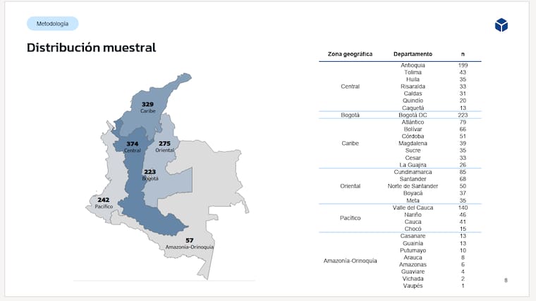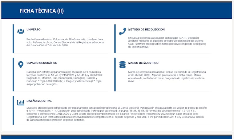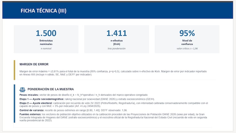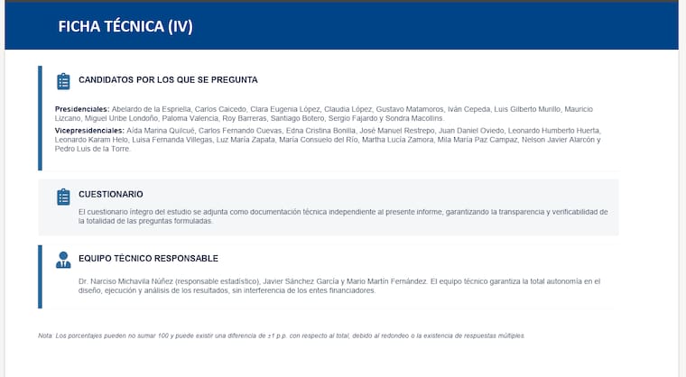 En el sondeo Iván Cepeda obtuvo el 36%, Abelardo de la Espriella 21%, Paloma Valencia 13%, Claudia López 3%, Sergio Fajardo 2%, Santiago Botero 0.8%, Miguel Uribe Londoño 0.6%, Luis Gilberto Murillo 0.4%, Clara Eugenia López 0.3%, Carlos Caicedo 0.2%, Mauricio Lizcano 0.1%, Sondra Macollins 0.1%, Roy Barreras 0.0%, Gustavo Matamoros 0.0%, En blanco 5 %, No votaría 6% y NS/NC 11%.