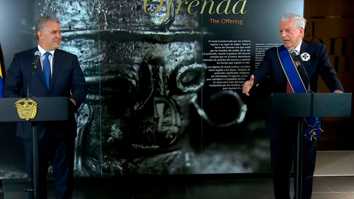 'El Mario Vargas Llosa ya no le pertenece al Perú. Es un patrimonio latinoamericano y hoy se lo hacemos saber como patrimonio colombiano'. Con estas palabras, el presidente de la República, Iván Duque, rindió un homenaje al Nobel de Literatura, Mario Vargas Llosa, durante un acto que se realizó anoche en el Museo del Oro.