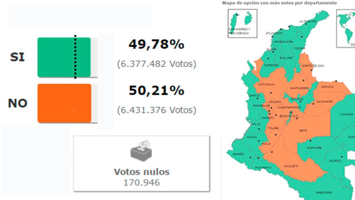 Con el 99,98% de las mesas escrutadas, el 'no' sumó 6.431.376 votos, un 50,21%, frente a los 6.377.482 sufragios alcanzados por el Sí, que representaron un 49,78%, una tendencia que se mantiene desde que el escrutinio de la Registraduría Nacional del Estado Civil, encargada de organizar los comicios, pasó la mitad del recuento.