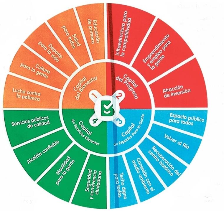 Cada uno de estos ejes están divididos por 'estrategias' que suman un total de 17 y comprenden aspectos específicos sobre problemáticas como, seguridad, movilidad, educación, etc.