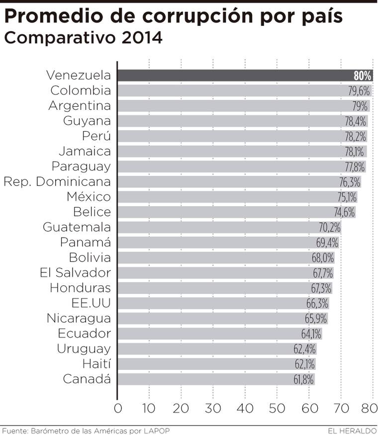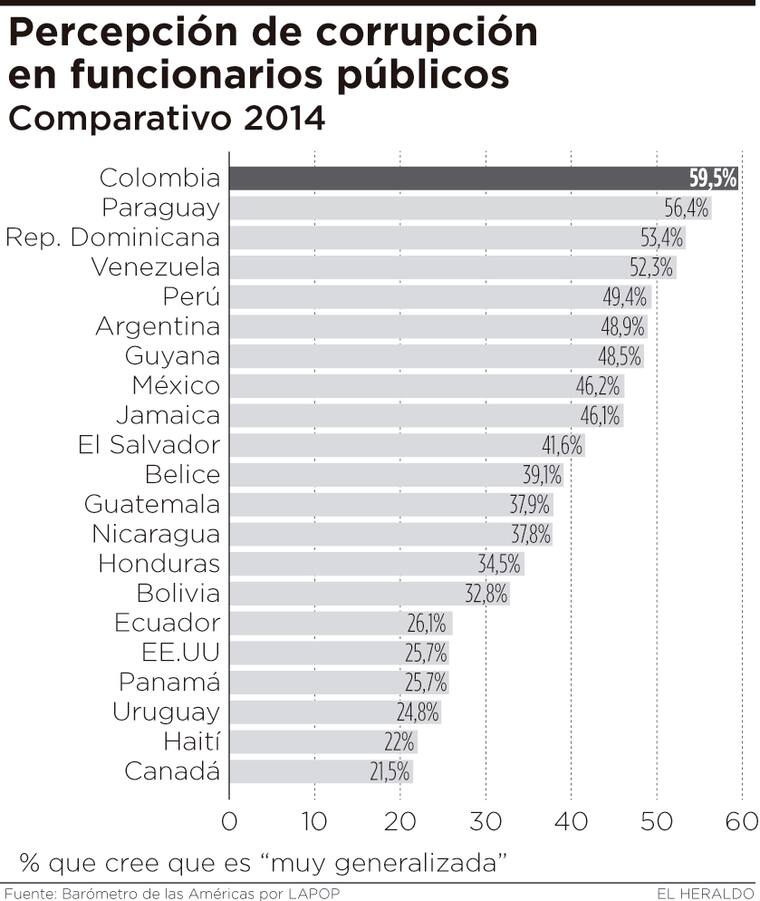 Los últimos resultados del Barómetro de las Américas, iniciativa que hace parte del Proyecto de Opinión Pública de América Latina (Lapop) y que busca medir la percepción de los ciudadanos de las Américas frente a la democracia y sus instituciones, revelaron que en Colombia la percepción de la corrupción alcanzó 79,6 puntos en una escala de 0 a 100, ubicándolo como el segundo país con mayor índice de corrupción del continente, únicamente superado por Venezuela con 80 puntos.