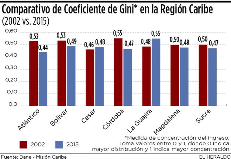 En lo que respecta a la desigualdad, los resultados en términos de distribución de los ingresos a nivel regional aparecen por debajo de la media nacional, con un coeficiente de Gini de 0,48 para el Caribe, contra 0,52 para el total nacional. De los 7 departamentos, solo el Gini de La Guajira (0,54) está por encima de la media nacional, ubicándolo como el más desigual de la región. Lo anterior, pese a que en el año 2002 registraba niveles de desigualdad inferiores, da muestras de un retroceso en términos de distribución adecuada de los recursos.