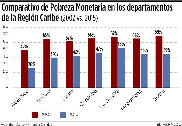 La pobreza en la Región Caribe ha disminuido, pero sigue estando por encima del promedio nacional. En el año 2002, la pobreza monetaria era del 63%, y para el 2015 había bajado 21 puntos hasta el 42%; sin embargo, en el mismo período, la disminución promedio nacional fue de 22 puntos porcentuales. Lo anterior significa que, en términos comparativos, la Región Caribe aún se encuentra en posición de rezago.