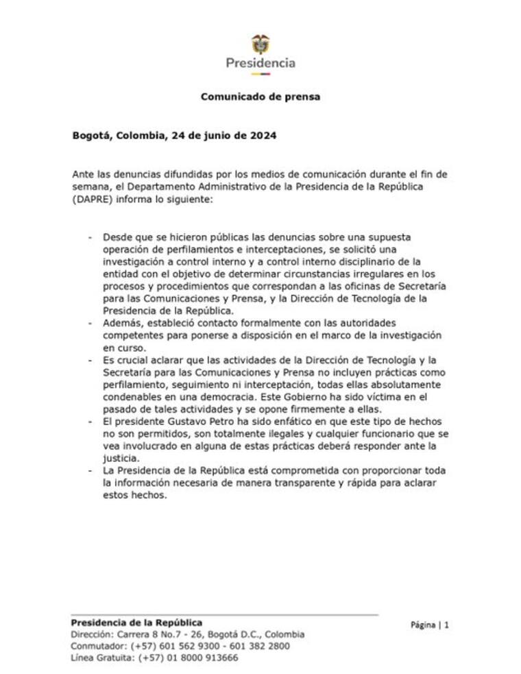 En un comunicado se lee que desde la Presidencia se solicitó 'una investigación a control interno y a control interno disciplinario de la entidad con el objetivo de determinar circunstancias irregulares en los procesos que correspondan a las oficinas de secretaría para las Comunicaciones y Prensa, y la Dirección de Tecnología de la Presidencia'.