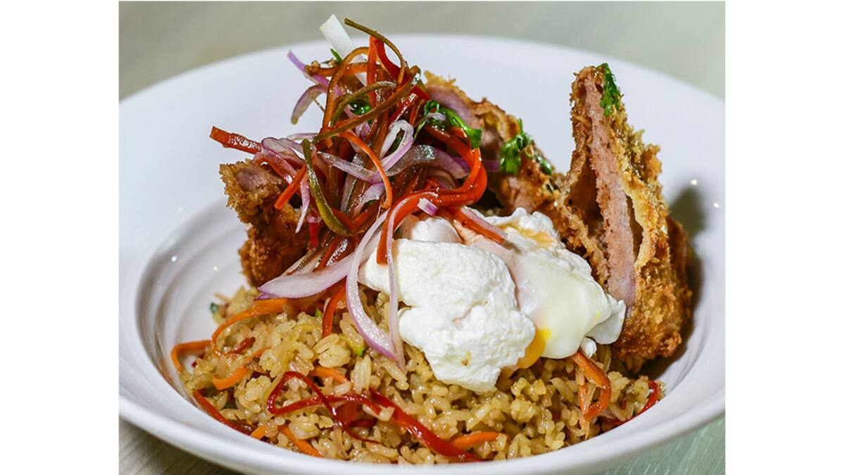 Para emplatar, el chef recomienda que en un plato hondo ponga el arroz chaufa de base, luego cubra un costado con el lomo de cerdo, y el otro con el huevo preparado al gusto. Bañe la milanesa con la salsa chifera y decore con la ensaladilla de ají criollo.