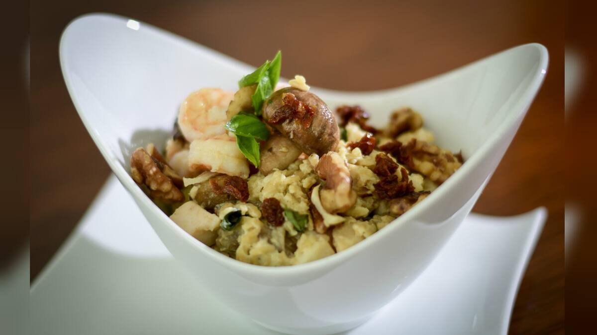 Ingredientes para 2 porciones... 250 g de orzo de garbanzos o cualquier pasta de su preferencia • 200 g de calamar • 200 g de camarón • 200 g de champiñones • 1 taza de albahaca fresca • 3 cucharadas de aceite de oliva • 60 g de mantequilla • 100 ml de crema de leche • 1/2 cebolla blanca picada • 2 cucharadas de tomate seco o fresco picado finamente • 2 dientes de ajo picados en láminas • Media cucharada de ralladura de limón • Media pera o manzana verde en trocitos • Media taza de nueces • Sal y pimienta.