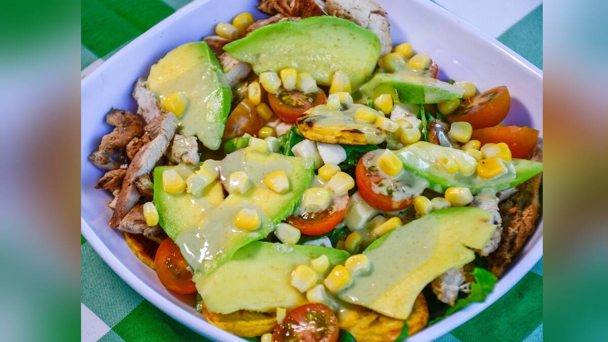 Corte en cuadritos pequeños la pechuga y sazone con orégano, pimienta y sal para ponerla al horno durante 10 minutos. Mientras tanto, sirva en un plato hondo la lechuga romana como base y, cuando esté lista, agregue la pechuga, el aguacate y el queso costeño bajo en sal cortado en cuadritos. Posteriormente añada los trocitos de plátano maduro que fueron previamente horneados. Luego parta cuatro tomates cherry a la mitad y agregue a un lado dentro del plato. Finalmente decore con cebolla crujiente. Así queda un almuerzo saludable, asequible y fácil de preparar.
