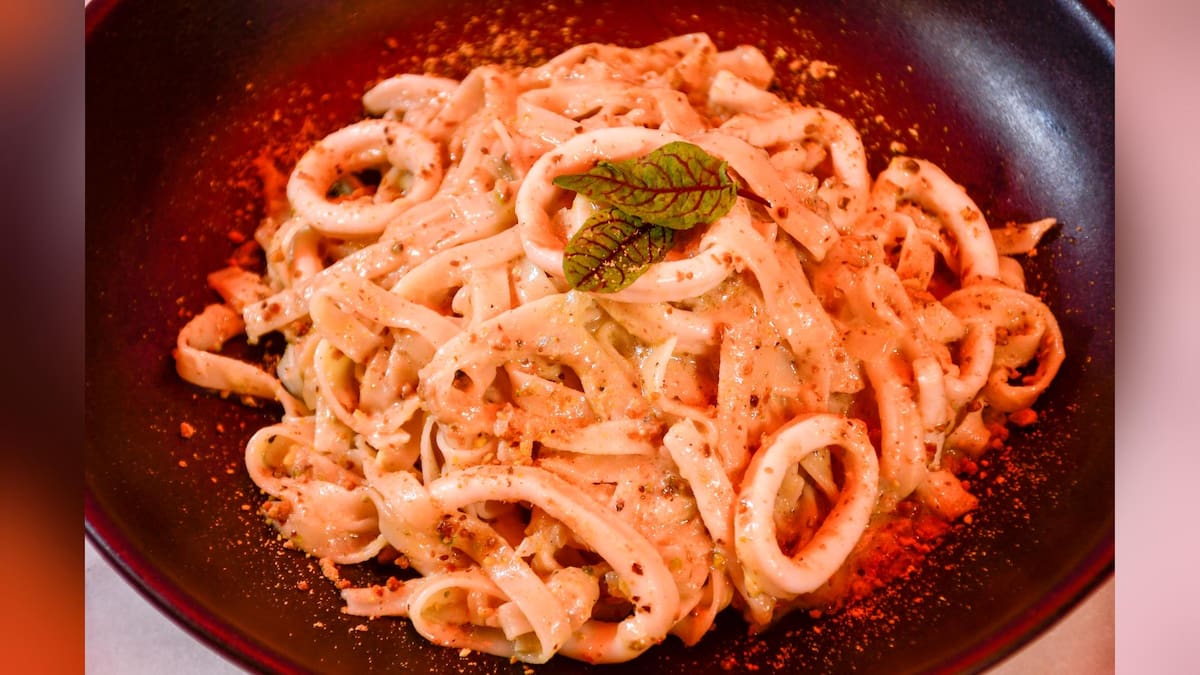 Lleve a fuego lento el pistacho con crema de leche y deje en reducción hasta que tome consistencia espesa. Luego agregue los anillos de calamares previamente sazonados y la pasta previamente cocida. Agregue sal y pimienta al gusto. Para finalizar, decore con brotes comestibles.