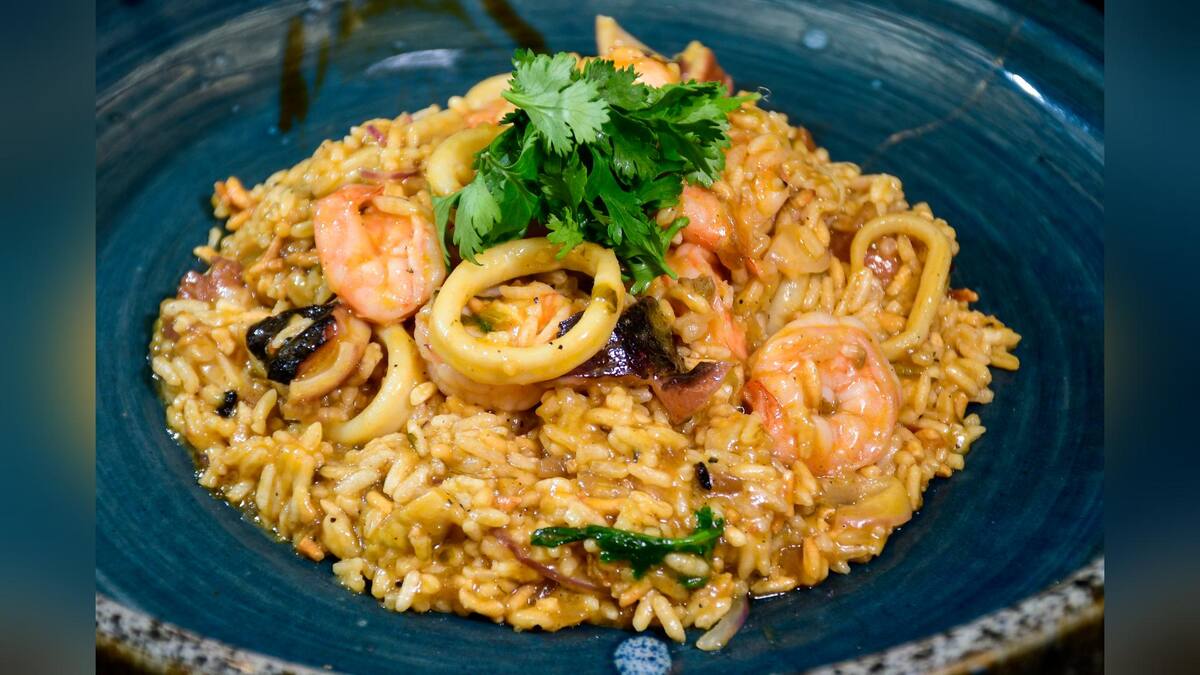 250 g de arroz cucayo • 20 g de cebolla criolla • 10 g de cilantro • 30 g de aceite de achiote • 50 g de pulpo • 120 g de camarón • 50 g de caracol copey cocido • 200 g de calamar • 20 g de vino blanco • 350 g de salsa encocada • Sal • pimienta negra entera