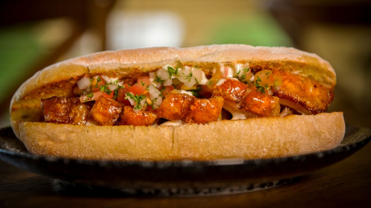 Pico de gallo (60 g de tomate, 20 g de tomate seco, 40 g de cebolla blanca, 15 g de perejil, 15 ml de vinagre, 20 g de azúcar y 5 g de sal) • 15 g de alioli dulce •120 g de cerdo horneado • 1 pan francés de masa madre de 14 cm • Mantequilla de jalapeño.