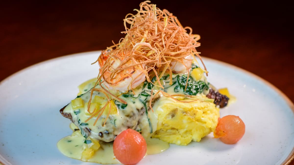 Ingredientes para una porción... 180 g de lomo fino • 60 g de langostinos (21/25) • 40 g de piña caramelizada • 40 g de espinaca • 30 g de salsa bechamel • 20 g de crema de leche • Sal y pimienta al gusto • Ajo • Zumo de limón • Puré de papa con queso costeño • Puerro frito y tomates cherry confitados