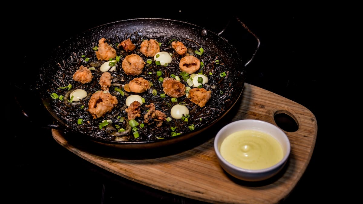 90 g de anillos de calamar • 30 g de marca (pan frito con ajo y perejil) • 40 g de tomate rallado • 80 g de fideos tostados • 160 g de fondo de mariscos • 10 g de tinta de calamar • 70 g de chipirones panizados y fritos • sal y alioli al gusto