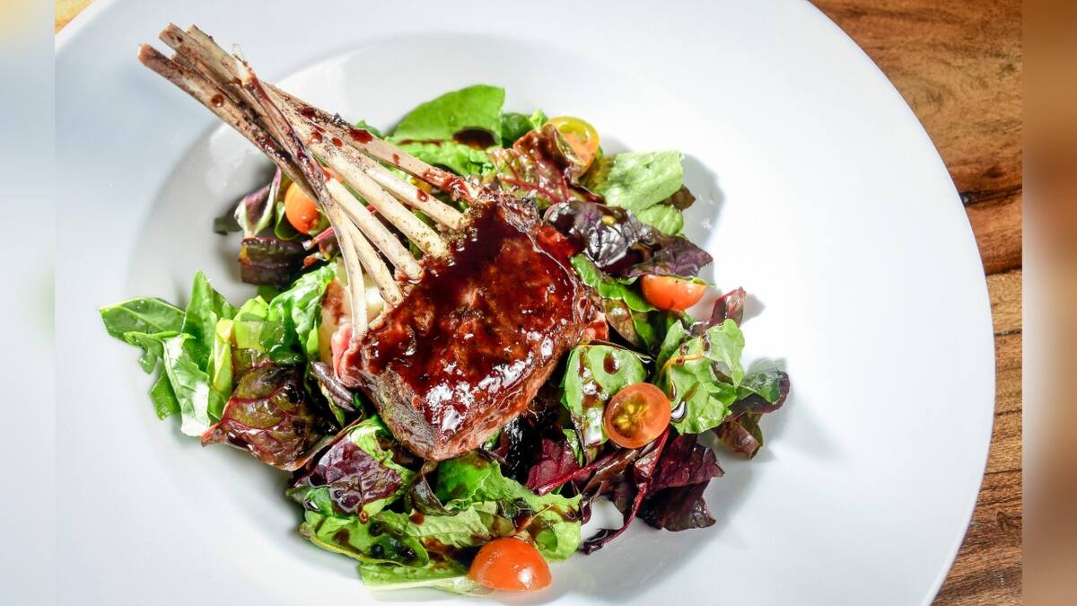 Ingredientes para una persona... 200 g de rack de cordero • pesto • sal y pimienta • aceite • vino tinto • azúcar • Salsa demi-glace (fondo de res) • zumo de limón • puré de papa • Mix de lechugas y tomate cherry • Vinagreta de aceite de oliva extra virgen con zumo de limón, sal y pimienta