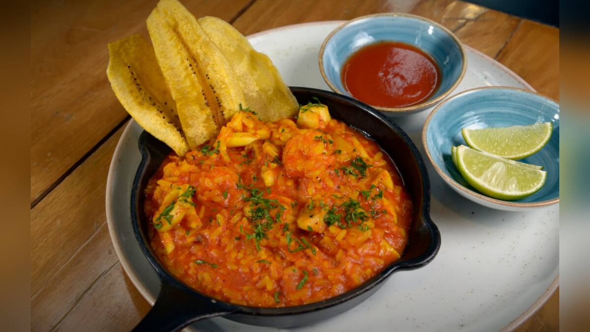 En una sartén o en un wok agrega la mantequilla y sofríe a fuego alto la tilapia en cubos. Luego agrega los mariscos (camarones y anillos de calamar). Deja cocinar hasta que cambien de color y después agrega la cebolla y el puré de ajo. Posteriormente pon el arroz rissotto previamente precocido. Luego agrega la salsa pomodoro y revuelve hasta integrar todos los ingredientes. Después agrega poco a poco el fondo de pescado hasta que la preparación se vaya tornando cremosa. Pon una pizca de sal, pimienta y sazonador de paella, y vuelve a revolver hasta que el líquido seque en un 30%. Al final agrega una cucharada de mantequilla. Si la mezcla tiende a secarse pon un poco más de caldo. Finalmente emplata y encima agrega perejil. Acompaña con unos chips de plátano verde y limón.