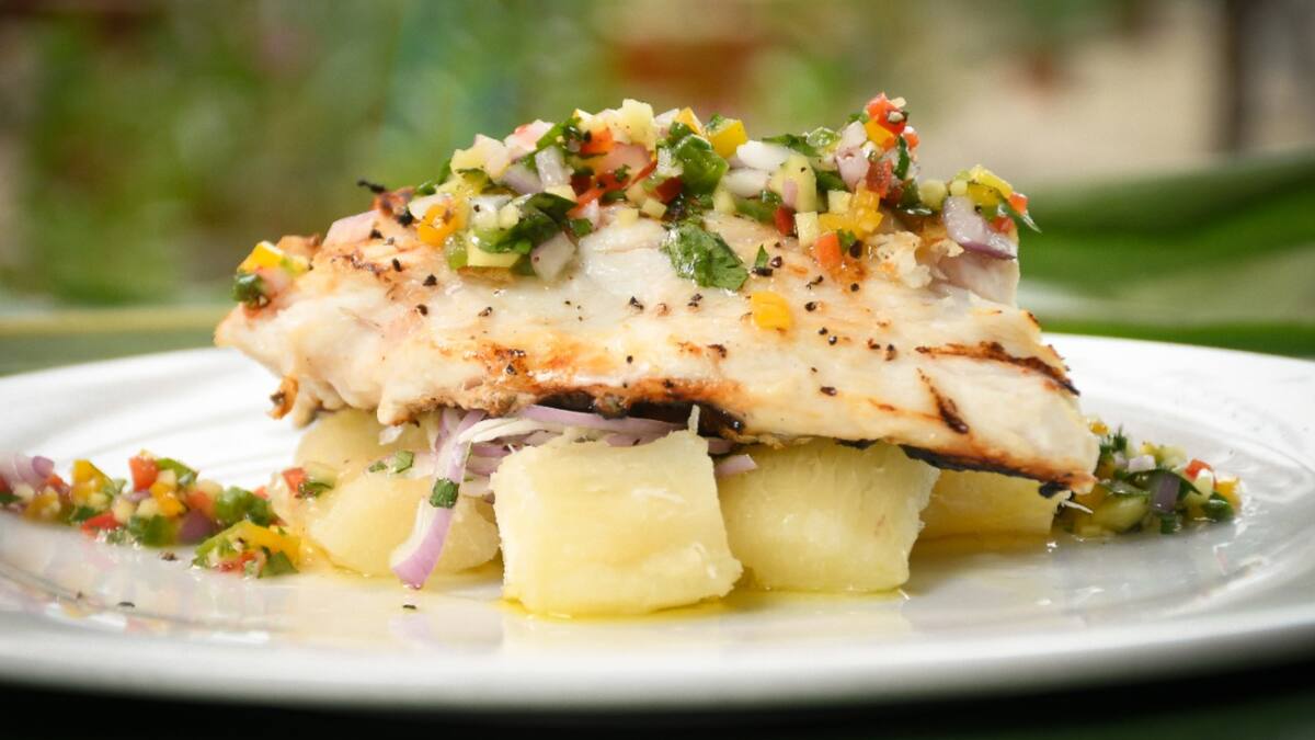 Ingredientes para una porción... 300 g de róbalo • 10 g de pimentón verde • 10 g de pimentón rojo •10 g de pimentón amarillo, 20 g de cebolla morada • 2 g de ajo • 40 ml de aceite de oliva • 2 g de sal • 2 g de pimienta • 120 g de yuca • 5 g de cilantro