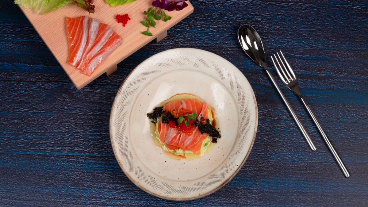 Ingredientes... 1/2 Aguacate • 1/4 cebolla roja • 80 gramos de salmón fresco 80gr (no congelado) • 1 cucharada de queso crema • 1 cucharadita de salsa de soya • 1/2 cucharadita de alga nori • 1 cucharadita aceite de ajonjolí • 1 pizca de caviar rojo.