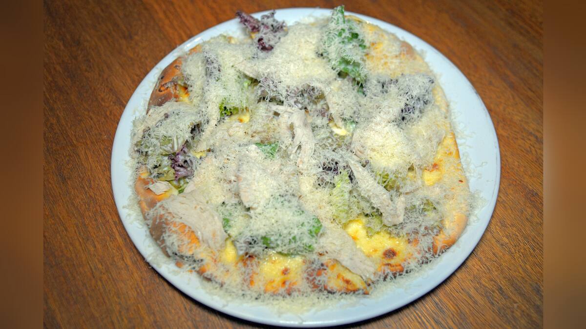 40 g de salsa bechamel • 100 g de queso doble crema rallado • 40 g de mézclum • 80 g de pavo • 30 g de vinagreta blanca • 15 g de queso parmesano y 200 g de masa pizza (romana).