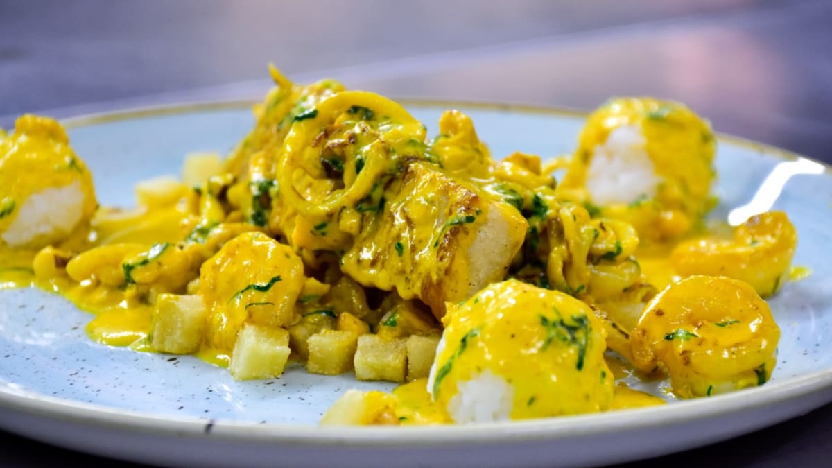 Ingredientes para una porción... 200 g de filete de pescado cherna • 50 g de calamar • 30 g de pulpo • 6 camarones • 50 g de papa • tres esferas de arroz gohan • pasta ají amarillo • cilantro fresco • pasta de ajo • pasta de cebolla y crema de leche (al gusto).