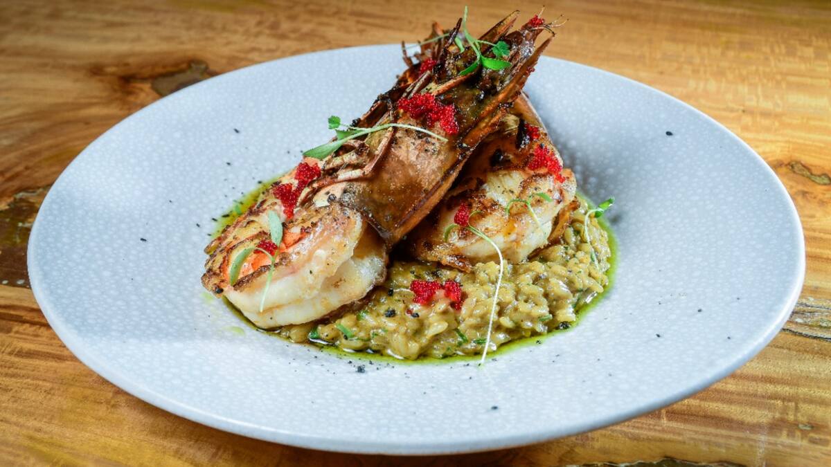 Ingredientes para una porción... 300 g de langostino tigre • 200 g de caldo de mariscos con curry • 60 g de arroz gohan 20 g de cebollín chino • 5 g de tobiko • 5 g de crema de leche • 15 g de cilantro y 10 g de mantequilla.