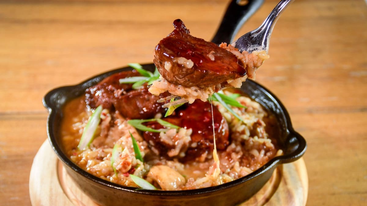 Paso a paso… Inicialmente precaliente un sartén de fondo y agregue de cinco a 10 mililitros de aceite. Luego vierta la cebolla finamente picada y saltéelas por aproximadamente dos minutos hasta cristalizar y dar un poco de color. Después agregue el tastasales (mezcla de cerdo y salami), sofría con la cebolla por dos minutos para sellar la carne, agregue un ‘shot’ de vino blanco y el arroz previamente cocido, revuelva con el sofrito anterior. Acto seguido integre el fondo de pollo con el extracto de trufa negra, los champiñones y el queso parmesano; mezcle enérgicamente hasta lograr una homogeneidad en la textura del risotto. Más tarde agregue la mantequilla para dar cremosidad y por último, en otra sartén, ponga los cortes de lomo de res para caramelizar con la salsa roso, durante dos o tres minutos. Para emplatar sirva el risotto y encima los cortes de res con la salsa. Para decorar agregue la pimienta rosada y la cebolla de verdeo en julianas