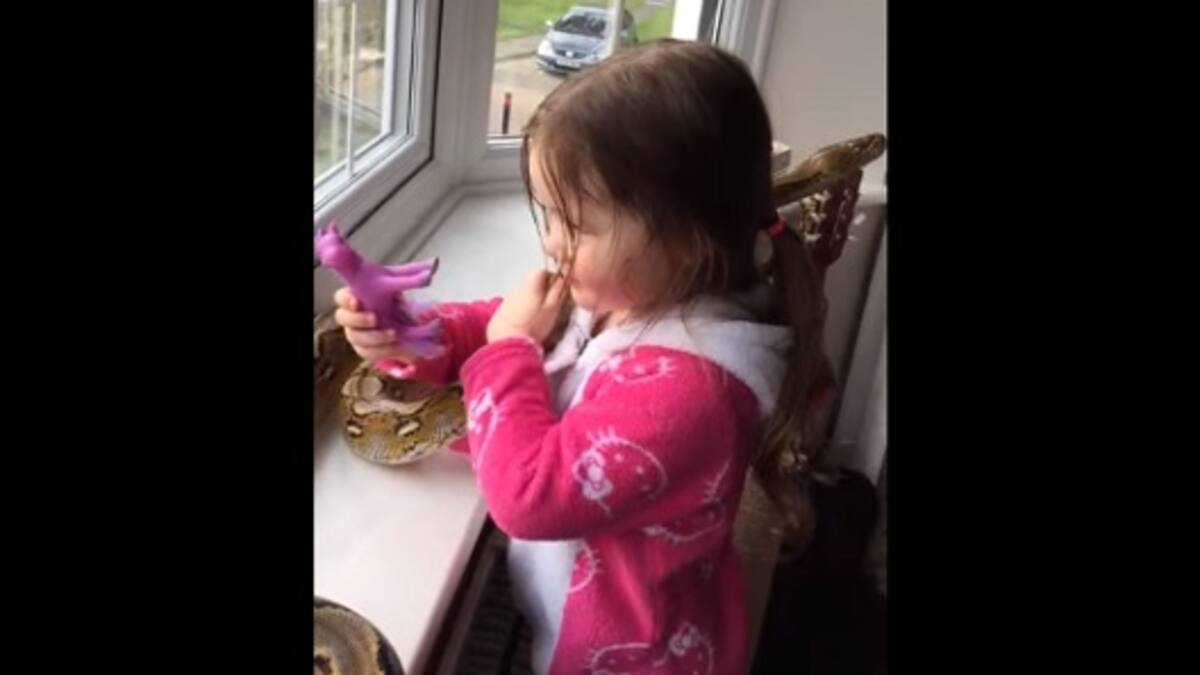 El juego inocente de una niña de tres años con una serpiente pitón ha impactado las redes sociales. A la pequeña se le ve tranquila mientras abraza al reptil de tres metros aproximadamente.