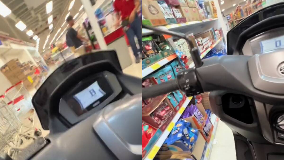 Para hacer la fila en la caja, el creador de contenido dejó parqueada la moto a varios metros, pero todavía al interior del establecimiento. Luego, se subió nuevamente en el vehículo y salió de la tienda.