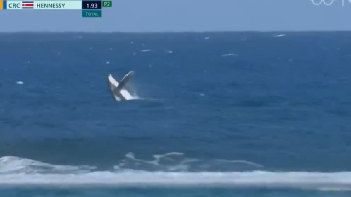 La espectacular postal que les dio la ballena a los fotógrafos que se encontraban en las justas, se dio mientras la brasileña Tatiana Weston-Webb y la costarricense Brisa Hennessy se enfrentaban, lo que causó aún más conmoción.
