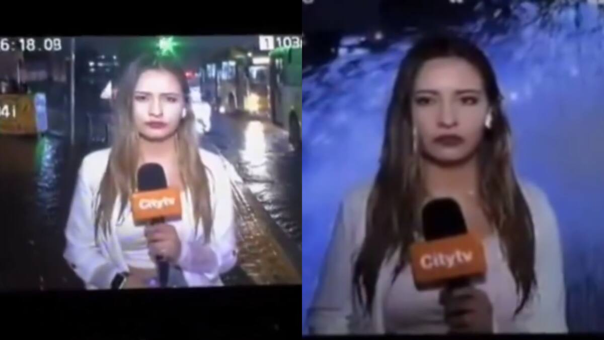 En un video que se hizo viral en redes sociales aparece una reportera de City TV que estaba grabando cuando pasó un del SITP por un charco que se encontraba cerca de ella, y terminó completamente empapada.