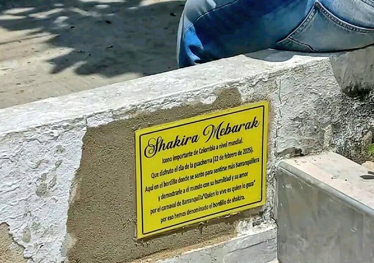La placa en honor a Shakira instalada en el bordillo dice: “Shakira Mebarak. Icono importante de Colombia a nivel mundial. Que disfruto el día de la guacherna (22 de febrero de 2025). Aquí en el bordillo donde se sento para sentirse más Barranquillera y demostrarle a él mundo con su humildad y su amor por el carnaval de Barranquilla “Quien lo vive es quien lo goza” por eso hemos denominado el bordillo de Shakira”.
