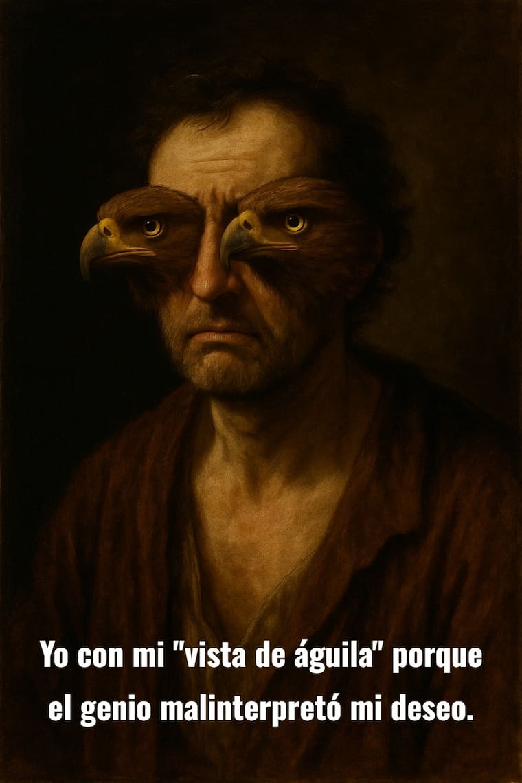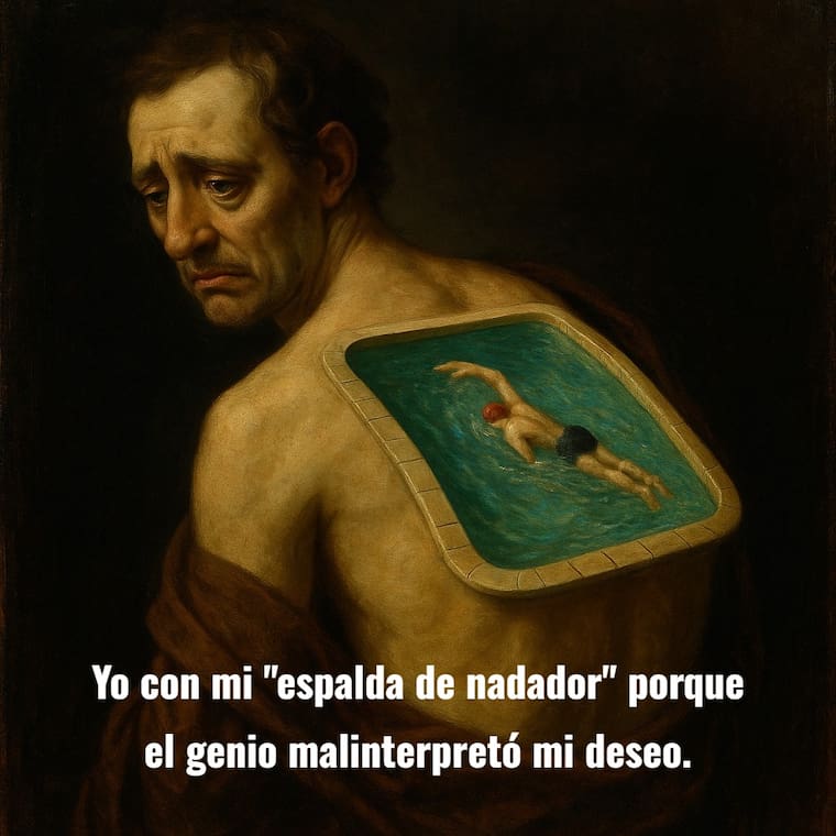 El concepto gira en torno a un deseo mal formulado, interpretado por un genio con cero contexto y nula intuición. Quien pidió “tener espalda de nadador”, por ejemplo, fue retratado con una espalda adornada con una pequeña piscina y un atleta flotando en ella. Otro solicitó “ojos de águila”, y terminó con dos águilas enteras sustituyendo sus globos oculares. Así de literal.