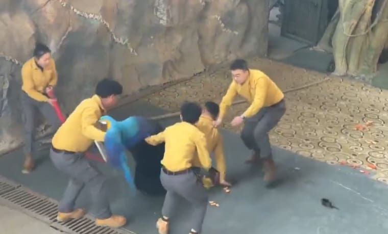 Cuando el cuidador intentó ayudarlo, el oso reaccionó de forma brusca y se abalanzó sobre él, derribándolo frente al público. De inmediato, otros trabajadores del parque corrieron para auxiliar al entrenador y usaron sillas, barras y objetos a su alcance para separar al animal. Luego de varios segundos de tensión, lograron controlarlo.
