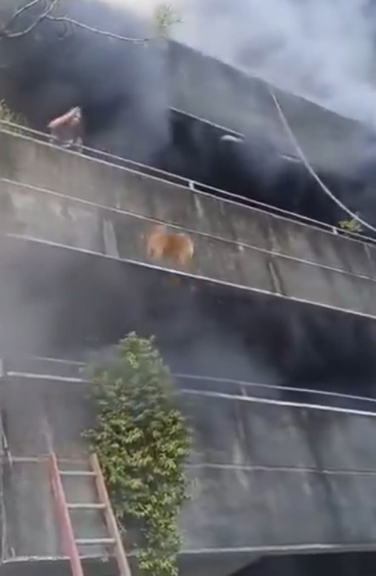 Desde el tercer nivel del edificio, lanzó a sus mascotas a los bomberos y vecinos que esperaban abajo. Luego intentó bajar por una escalera de rescate que apenas llegaba al segundo piso, hasta que finalmente pudo ser auxiliada.