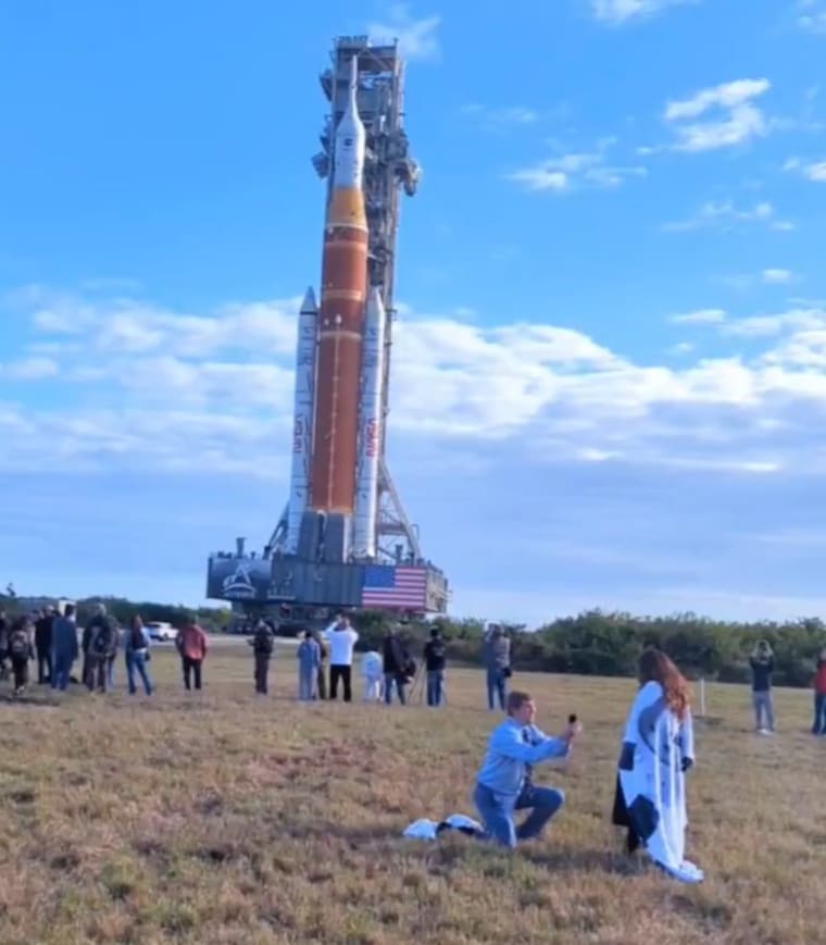 Durante el traslado del cohete Space Launch System (SLS), un ingeniero de la NASA aprovechó el imponente escenario para hacer una propuesta de matrimonio que rápidamente se volvió viral.