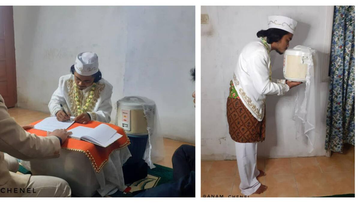 En las imágenes, el novio firma los documentos en presencia de un presunto juez y un testigo, mientras mantiene a su lado a la blanca y radiante novia: una arrocera eléctrica marca Philips.