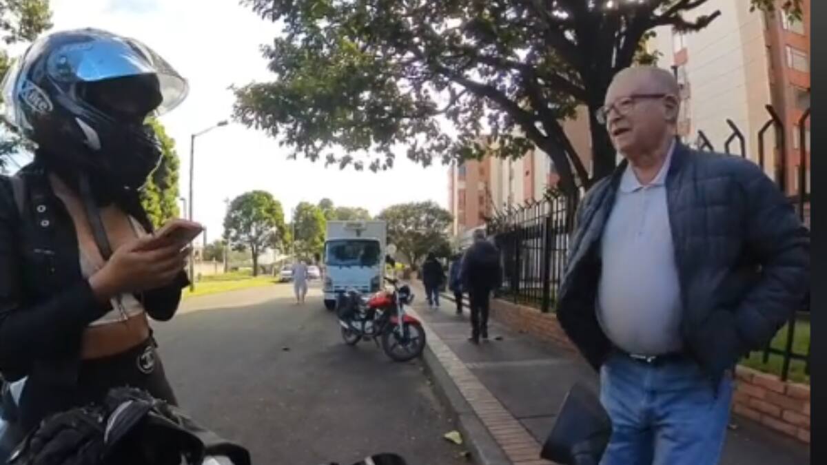 El video que se ha hecho viral en las últimas horas, muestra a la joven esperando junto a su moto, en una avenida en Bogotá, cuando de repente se le acerca un adulto mayor a decirle cosas incómodas.