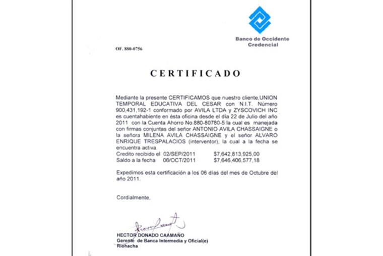 Ávila hizo la precisión, refiriéndose al informe del Comité de Seguimiento y Evaluación a la Inversión de las Regalías del Carbón del Cesar, según el cual, esos dineros están en riesgo porque el anticipo se gastó. El empresario mostró copia de la certificación expedida por la entidad bancaria con fecha seis de octubre de este año, indicando que los dineros girados permanecen intactos, y que han generado un rendimiento financiero de más de tres millones de pesos a favor de la administración seccional.
