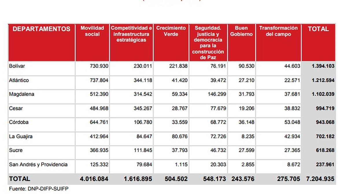 De acuerdo con la versión preliminar de la regionalización de inversión del Presupuesto General de la Nación, planteada por el DNP para discusión en el Congreso, en medio del segundo y último debate en las plenarias, la inversión en el Caribe bajaría de 8,9 en 2017 a 7,2 billones de pesos en 2018.